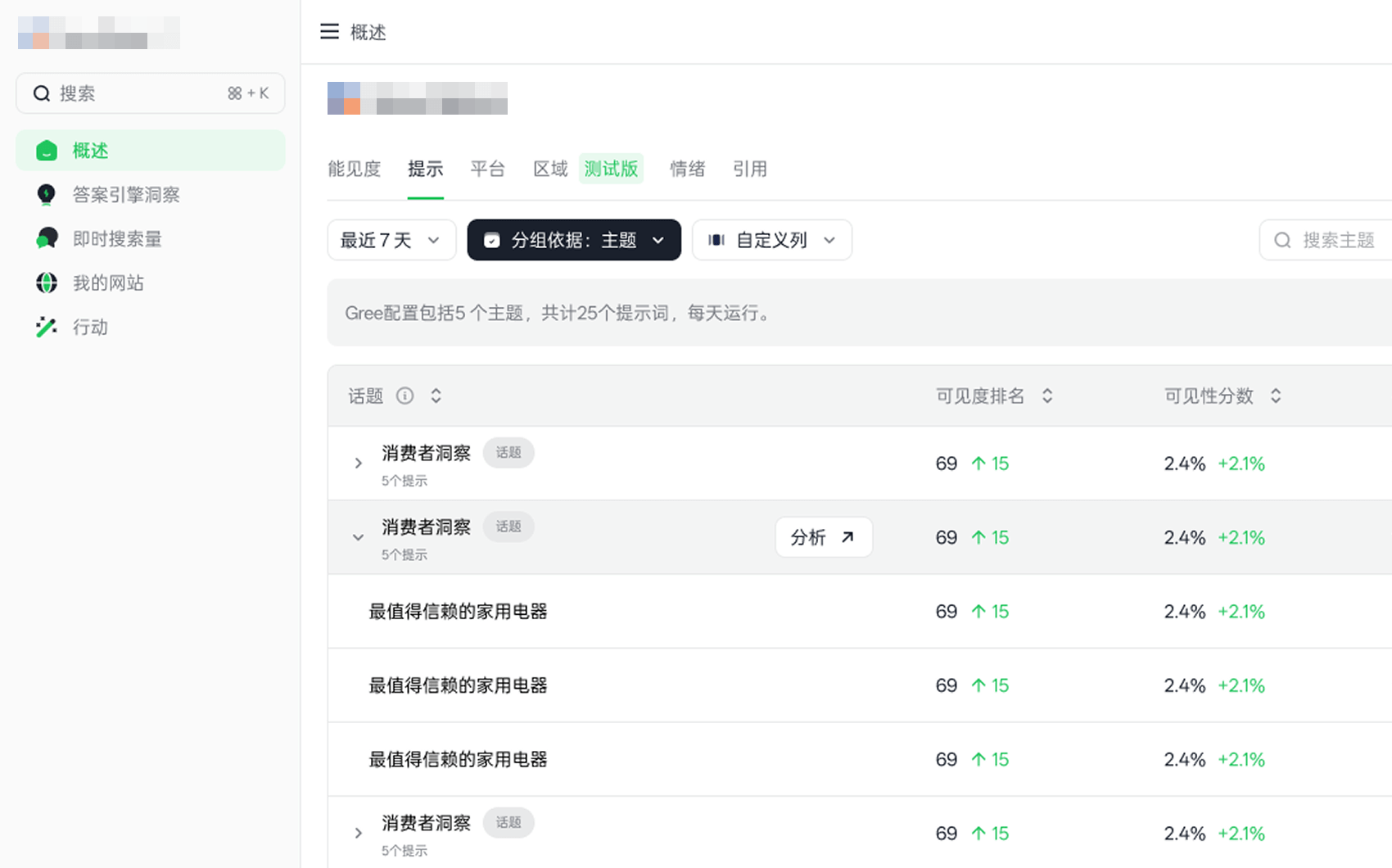 跟踪您的 AI 可见性,查看 AI 在何处以及如何提及您的品牌,并发现增强您知名度的见解。