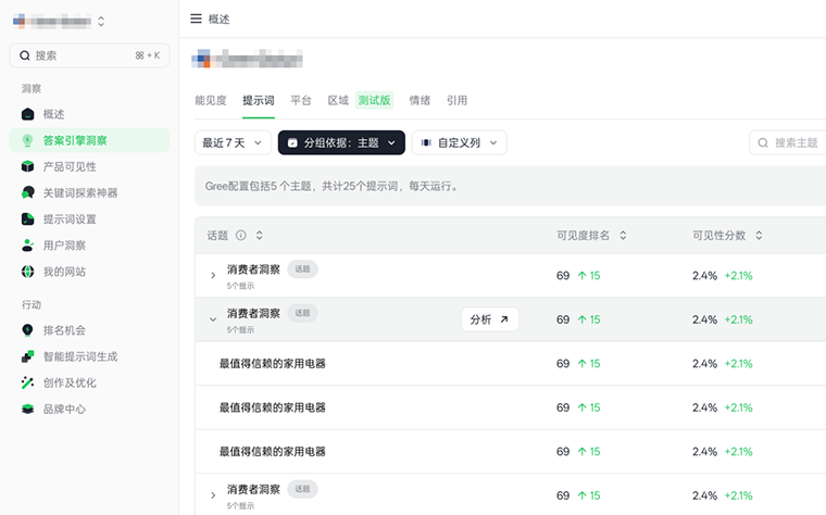 品牌提及与关注,查看 AI 如何识别及如何回应需求,并发现最常问的品牌相关问题。